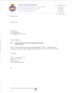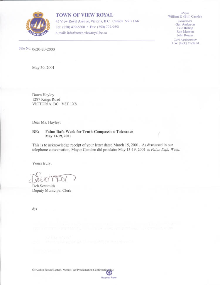 【明慧网2001年6月4日】加拿大不列颠哥伦比亚省皇家景色镇宣布2001年5月13日至19日为“法轮大法周”。