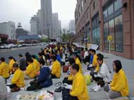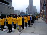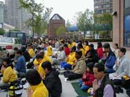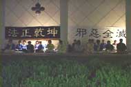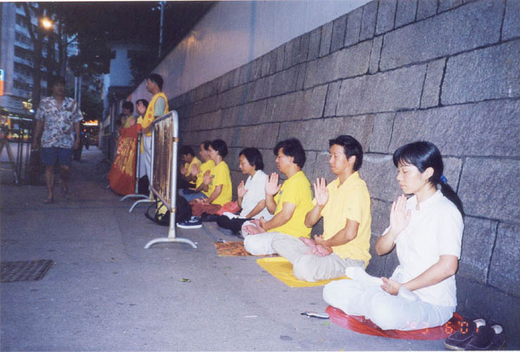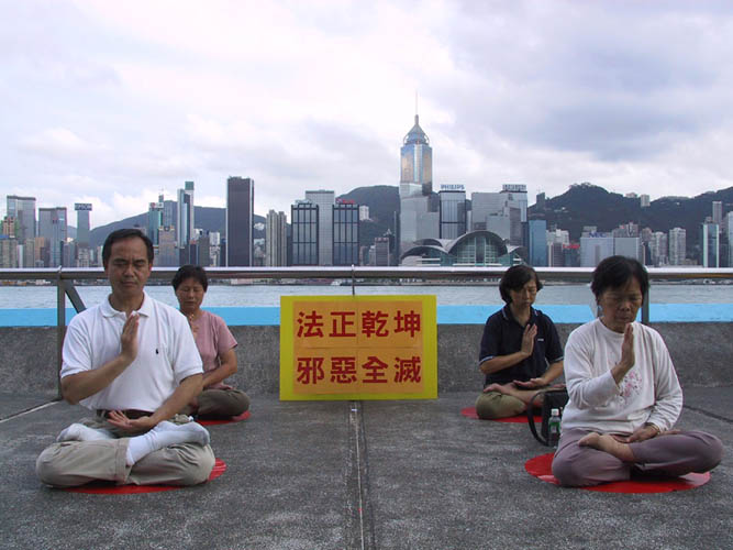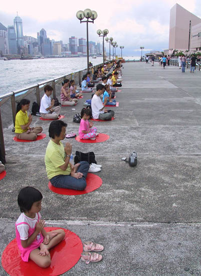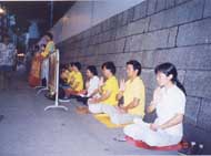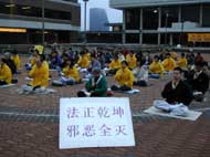 | 70多名学员在尖沙咀海滨公园齐心合力清除邪恶 | 学员在尖沙咀海滨公园发正念 | 三十多位学员在中联办外发正念 |