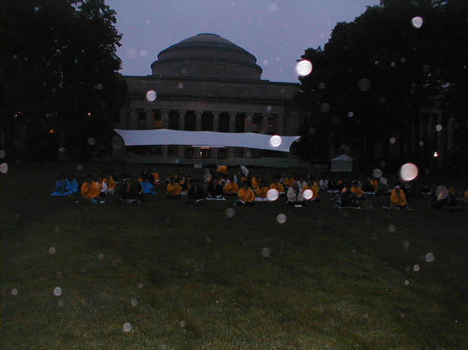 清晨5点的查尔斯河畔睡意朦胧,毛毛雾雨把MIT前的大草坪蒙上了神秘的面纱。弟子们一个个驱车悄然而至,以纯洁的心态等待着这一伟大时刻的到来。5点正,6点正,7点正,每一轮发正念铲除邪恶前,我们都先静坐5分钟,清除自身头脑中的不好的想法,观念以及思想业,然后做10分钟的铲除邪恶。三次发正念中,感觉正念一次比一次强,心态一次比一次纯。从下面所附的照片中,我们可以看到,当时场中法轮象雪花似的飞舞,弥漫在空中。“大法弟子的正念是有威力的”我们再一次感到师父伟大的慈悲所给予我们弟子的又一次建立威德的机遇。愿我们走好正法中的每一步,决不辜负师父的慈悲苦度。让我们在伟大的法中,在这个伟大的正法时代,成就我们最伟大的圆满。