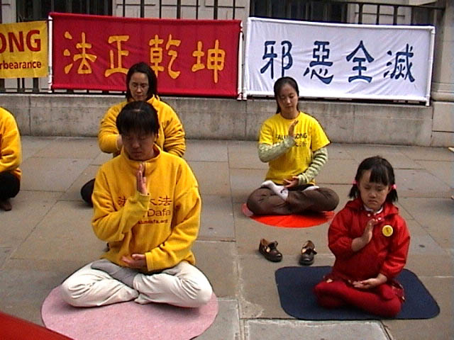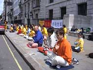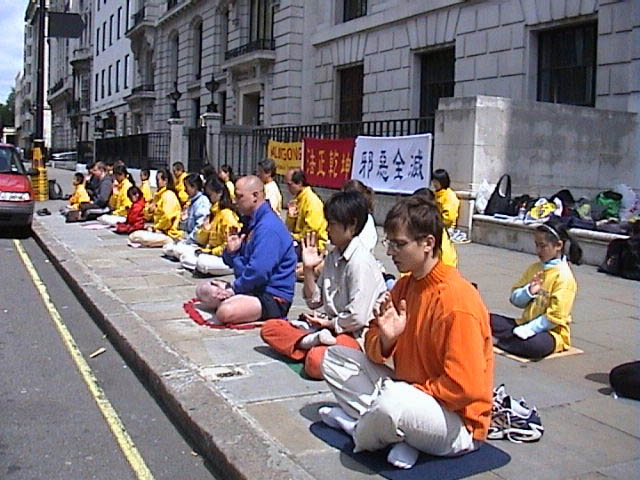 来自大伦敦地区和伦敦附近城市的大法弟子约五十人,在中国大使馆门前,集体炼五套功法。来往车辆上的人们,都被这壮观的场面吸引了,几乎人人都接过了大法弟子递上的大法资料,有的旅行大巴士驶过,车上的导游还接过一叠大法资料,发给车上来伦敦的国际游人。