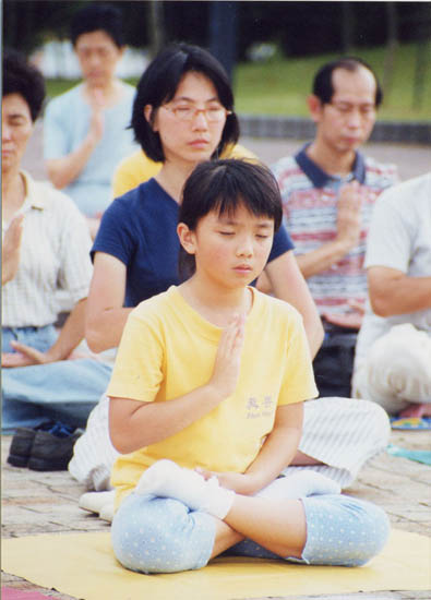| 太古城海旁公园内,七岁的小女孩在除恶 | 五十个学员在沙田中央公园集体发正念清除邪恶 |