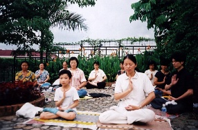 5点整时间一到,我们开始齐发正念。周围的弟子有闭眼坐那里的,也有立掌的,走动的。我们目不斜视,集中精力心中默念“法正乾坤,邪恶全灭”。