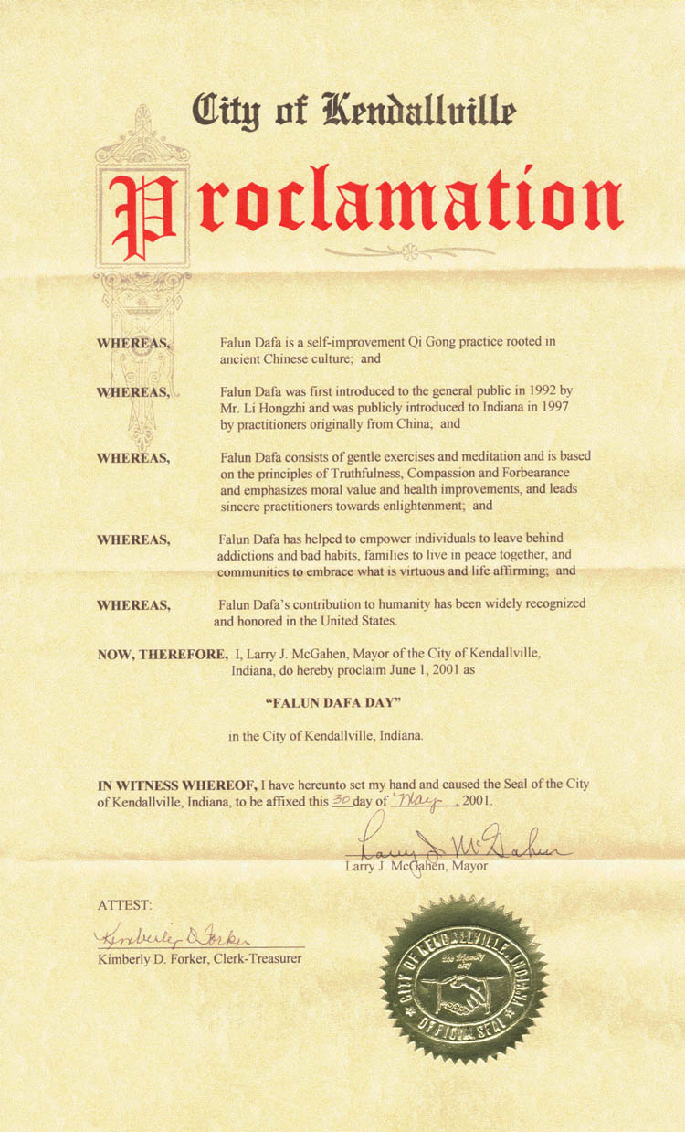 【明慧网2001年6月5日】印第安那州肯度维尔市宣布2001年6月1日为“法轮大法日”。