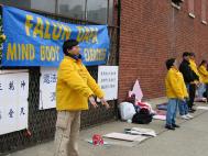 江泽民流氓集团丧尽天良地迫害法轮大法已近两年,不断有大法学员被抓,被打,被迫害致死,包括一些海外回国的大法学员。国内的学员上访无门,伸冤无处。我们国外的学员理所应当地去中国使馆请愿,强烈要求中国政府制止被大赦国际评为“人权流氓”的江泽民的犯罪行为,立即释放所有被抓的大法学员,还李洪志师父清白!芝加哥大法弟子现在几乎天天去中共领馆和平请愿,极大地抑制了邪恶势力的嚣张,同时使更多的世人有机会了解了真相!周六下午,几十位大法弟子如往常一样赶赴领馆炼功请愿,一部分学员从图片展直接去领馆,也顾不上吃中午饭。不管刮风下雨,请愿活动雷打不动。大家的心很定:只要不停止迫害,就不停止在中共使馆前的和平请愿!