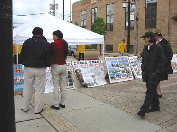 我们认识到,讲清真相,揭露邪恶是当前我们在人中证实大法,慈悲地救度世人的重要方式。只要正法的事情没有结束,我们就要坚持不懈地去做。芝加哥的唐人街是当地华人集中的地区,也是受毒害最深的地方。不少西方人也爱逛唐人街,并且大陆来的旅游团也经常光顾此地。学员们经常在唐人街举办图片展,效果非常好。一整天的图片展加上学员热情耐心地主动讲解,给过往的行人提供了一次次的机会。在大幅的揭露江泽民一伙残害善良的法轮功学员的铁证图片以及揭露自焚事件真相的详细图片报道面前,不少行人驻足,询问,索取资料,并且对江氏的邪恶暴行进行谴责;也有一些人不愿接受真相,匆匆离去或持反对态度;还有一些人小心翼翼的看图片,却不敢和学员接触;有两位中年男士,偷偷地观看图片,见学员过来介绍递资料,吓得赶紧走开,不一回又偷偷过来看,当学员找机会说上话时才知是从中国大陆来美访问的。芸芸众生那,自己此时的一念就能定下未来的福祸,多么容易又是多么难那!学员们将尽自己最大努力,不遗余力地揭露邪恶,讲清真相,能救一个是一个。