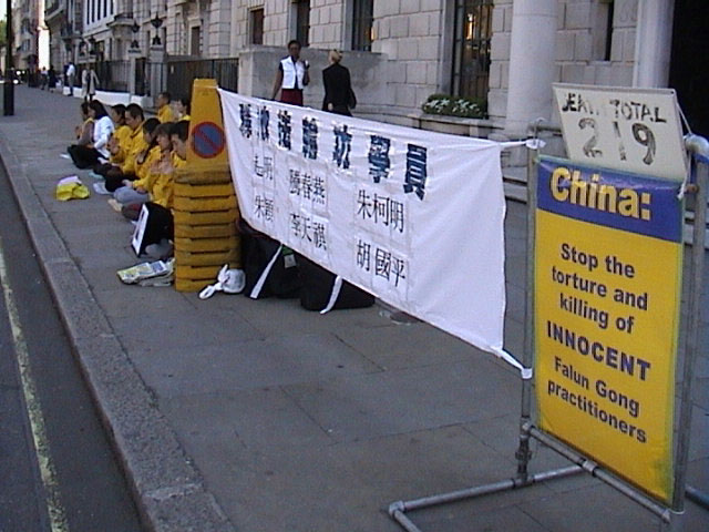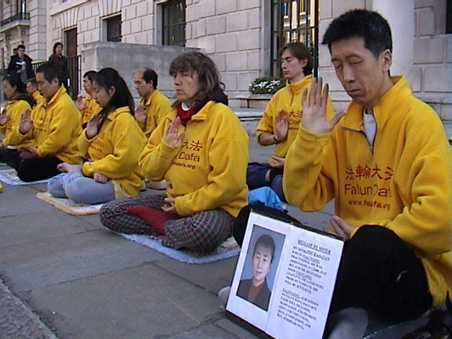 来自伦敦及附近地区的二十多名弟子参加了今天的营救活动。炼功后,弟子们静坐下来,先用5分钟时间清除自己思想中不好的思想念头、业力和不好的观念或外来干扰,再用5分钟时间,同时发正念并默念师父常用的正法口诀“法正乾坤,邪恶全灭”。随后,一名西人弟子前去大使馆递交要求中国(江泽民)政府无条件释放被非法关押的法轮功学员的请愿信。在中国大使馆门前执行公务的英方警察代替收下了请愿信并告诉此弟子:一定确保帮助将此信转交给中国大使馆。
