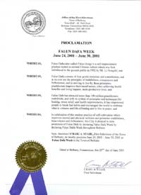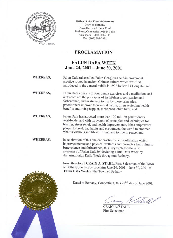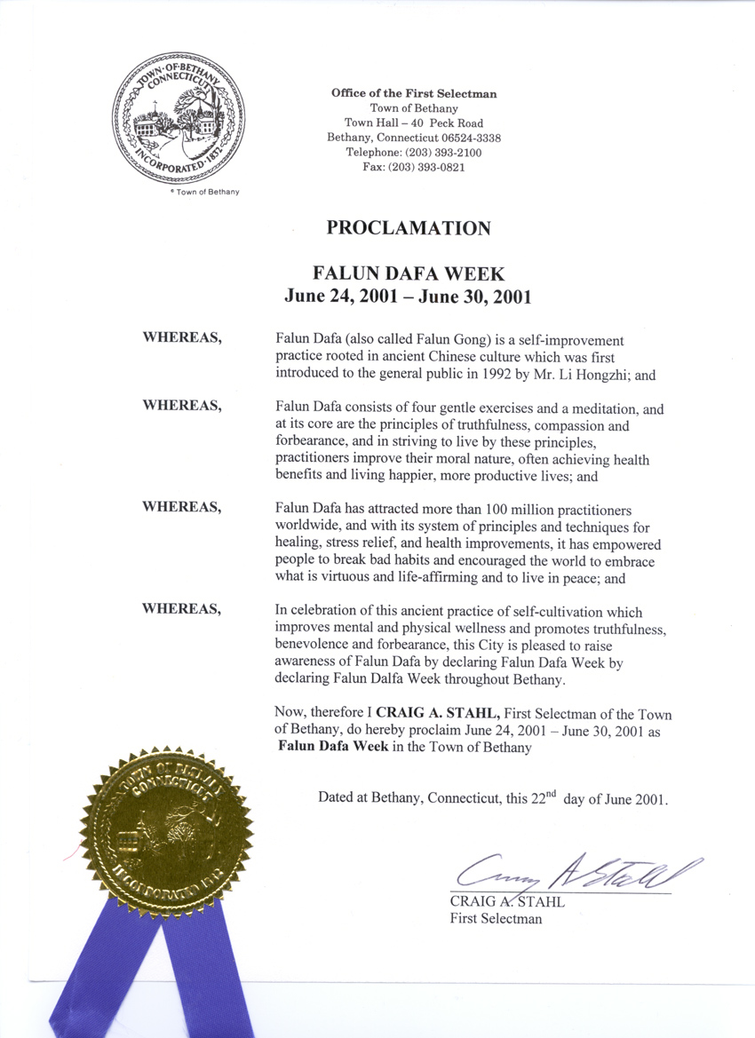 【明慧网2001年7月1日】康涅狄格州蓓丝妮镇宣布2001年6月24日至30日为“法轮大法周”。