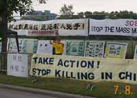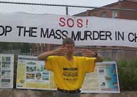 第二天,弟子们来到了中国领馆前,从上午十点到下午五点,大家在写着“停止虐杀!”“释放所有法轮大法修炼者!”的横幅前炼功、发正念和发放真象材料。
