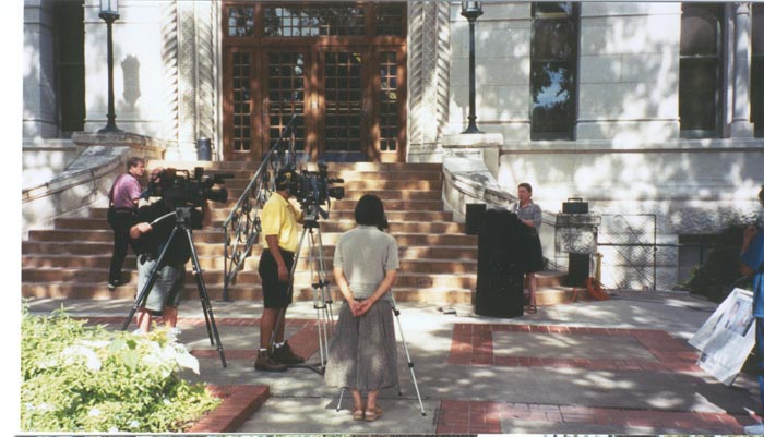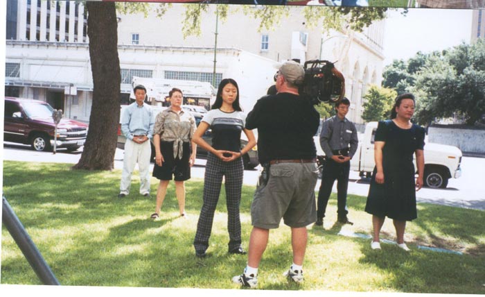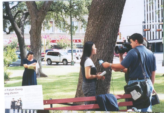 为揭露江氏流氓集团对大法弟子犯下的罪恶及它的欺世谎言,7月6日,来自奥斯汀、圣安东尼奥的十几名大法弟子在圣安东尼奥市政厅前举行新闻发布会,揭露这次惨案,并向全市人民发出紧急呼吁:制止杀戮,援救中国受迫害的法轮功学员。