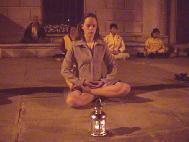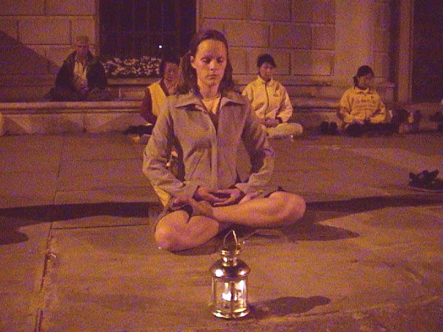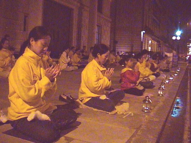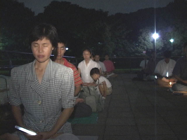 同日晚间数十名日本法轮大法学员在上野公园的喷水池旁,为悼念在万家劳教所死去的十五名女学员及所有被迫害致死的法轮大法学员举行了烛光守夜。