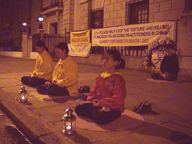由于事前向警察申请,当时有二位警察到场维护秩序。当警察了解了在中国大陆发生的对法轮大法修炼者的非人迫害后,非常同情我们,他们对大法弟子的和平请愿很赞赏,也喜欢当时的祥和气氛。通过步话机,他们向其他同事介绍说:“我们现在在中国使馆前执行任务,这里有法轮功的抗议活动,场面非常祥和。”当有过路人询问发生了什么事时,警察开始向路人讲真象,介绍在中国大陆发生的事情。看到警察讲述时的认真态度,弟子从心底感到高兴,同时也为在中国向大陆弟子施暴的警察感到悲哀。