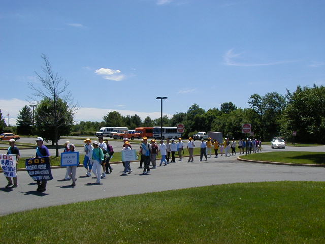 报导说步行者们包括移居海外的中国人和美国人,他们举行这次步行活动的目的是唤起人们关注中国的法轮功修炼者正在遭受的迫害。过去两年里,在中国有200名法轮功追随者在警察拘押期间死亡。
