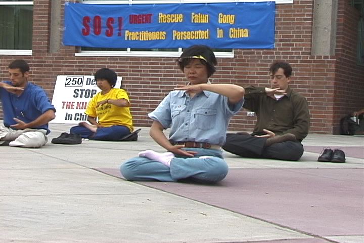 11:30当我们炼动功时,天空下起了雨点,动功结束时雨越下越密,这时正有电视台对我们采访,我们学员毫不犹豫开始打坐。等我们静功炼完后雨停了,紧接着我们开始发正念,发完正念后,天空放晴。使每一位学员感到了大法的威力。一位西人学员事后说:当他开始清除自己不好的思想时,他感到自己在一秒钟之内一下就静下来,在做立掌时,他感到从头两侧和头顶发出东西。他认识到时间的紧迫和师父的慈悲。