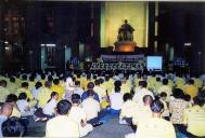 在着白衣女学员手捧为大法献出生命的弟子相片走向会场前方与所有学员齐发正念除恶中,整个活动在庄严肃穆气氛下正式开始。