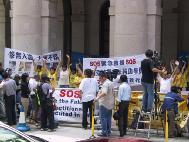 7月11日,香港立法会休会前的最后一次会议,香港学员在立法会门外请愿,呼吁特区政府与学员沟通对话,真正地了解法轮功,停止对法轮大法诬蔑不实之词及压制的做法,并呼吁立法会议员及社会人士紧急救援在中国受到迫害的法轮功学员。