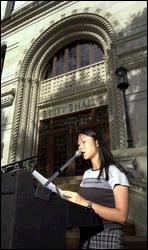 圣安东尼奥新闻快递2001年7月7日报导,为谴责中国镇压法轮功运动,星期五十多人在圣安东尼奥市政府大楼的阶梯上集会,表达他们对在镇压中被逮捕的家庭成员、朋友的支持。