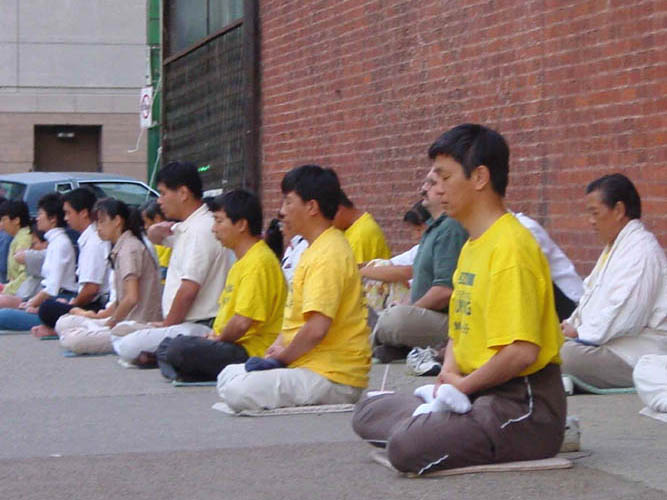【明慧网2001年7月12日】惊闻又有10余名男大法弟子被黑龙江省长林子劳教所打死,而官方消息再次对外谎称7名大法弟子上吊自杀。7月11日一早,芝加哥地区就有二十多位大法弟子赶到中领馆前呼吁紧急救援、抗议虐杀。晚上8点芝加哥地区四十多名法轮大法弟子在中领馆前召开了“呼吁全世界善良的人们:紧急救援,制止虐杀”为主题的新闻发布会。