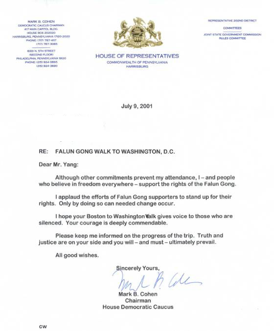 【明慧网2001年7月14日】宾州众议院民主委员会主席致宾州学员的贺信:支持宾州法轮功学员的紧急营救行动。