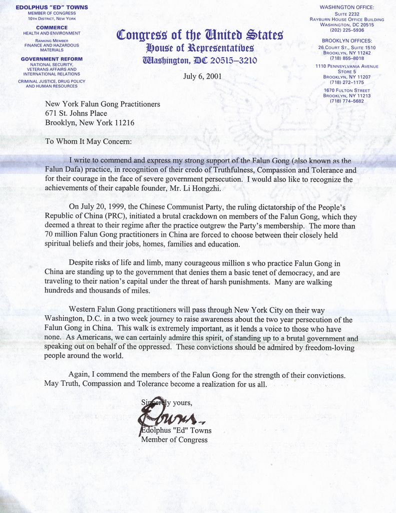 我写此信致意并表达我对法轮功(又称法轮大法)的全心支持,为了他们的信仰真善忍以及面对残酷的政府的迫害他们表现出的勇气。同时我也愿意认同他们有能力的创始人李洪志先生的成绩。
