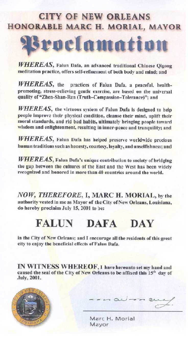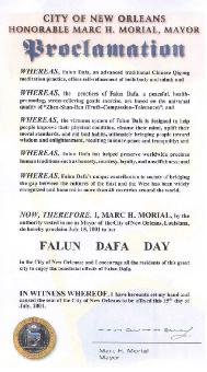 【明慧网2001年7月15日】路易斯安那州新奥尔良市宣布2001年7月15日为“法轮大法日”。