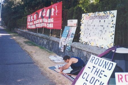 7月10日,大法弟子曼苏首先开始了每天24小时连续在中国驻温哥华领事馆门口的静坐救援活动。巨大的“紧急救援阻止虐杀”的中、英文横幅醒目地挂在流水般的车道边上,小小的简易帐篷向世人表达了他坚定的决心。曼苏的行动得到了温哥华全体大法学员的支持与响应,几天来,其他大法学员源源不断地来到领事馆门口,和曼苏一起坚持日复一日的24小时静坐呼吁。