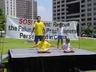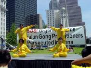 从加州横穿美国来到印地安那波利斯的法轮功学员在市中心烈士纪念碑广场炼功。报道说:他们不仅是做功法展示。他们的发言人说:我们希望寻求各种可能的办法制止在中国进行的迫害。