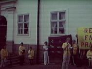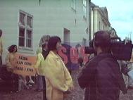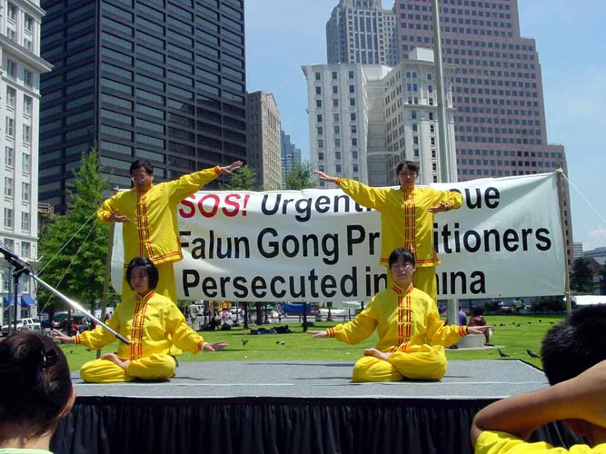中国刚刚获得2008年的奥运会主办权。这些法轮功练习者在提醒美国人关注在中国对法轮功群众的迫害和杀戮。发言人说:“在一天的时间里,有15名法轮功炼习者在中国的劳教所被迫害致死。”
