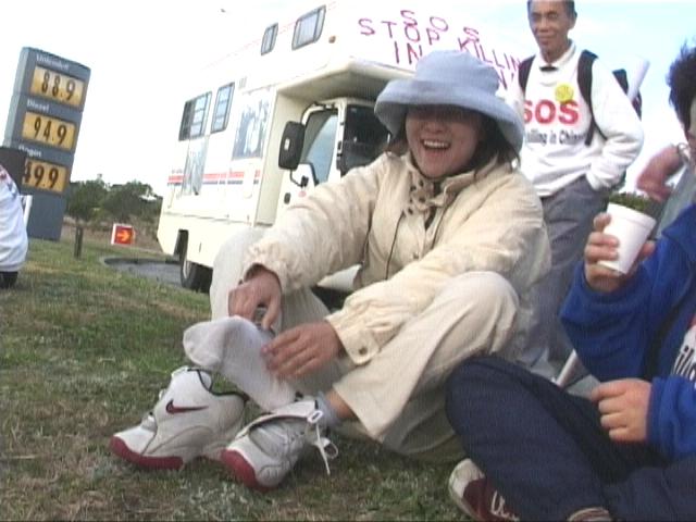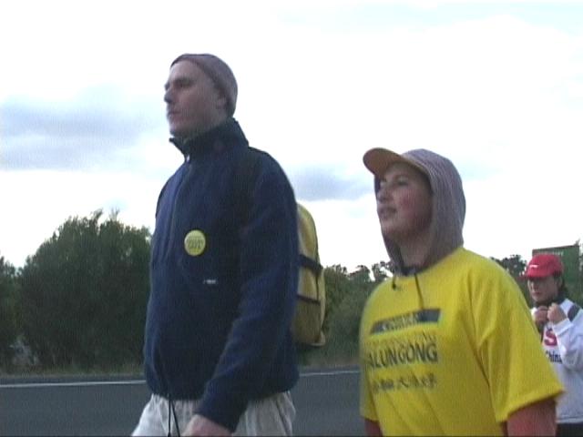 六月二十六日从波士顿出发的汪昊表示,二个星期以来他们在九十度以上的高温下每天步行二十哩,又碰到好几次大雷雨,有的人脚起了水泡、皮肤晒伤,身体的痛苦,让他们兴起了放弃的念头,但是每当想到大陆受迫害的同修,这点苦又算什么。