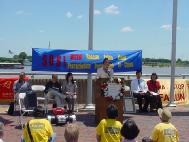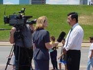 我们的新闻发布会就选在密西西比河畔的观赏台举行。下午1点,新闻发布会准时开始,当地主要的新闻媒体,ABC,FOX,NBC和CBS电视台,KMOX圣路易斯之音广播电台,和两家报社的记者也纷纷赶来采访学员。