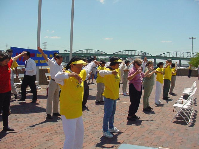 我们早上在杰佛逊大学公园里炼功,这是除纽约中心公园外,美国最大的公园了。她使我想起旧金山的金门桥公园,十分宽阔,而且还有博物馆,大会厅等等。今天是此行第一次我们做了完整的两个小时的动功和静功,我们都感到轻松愉快。祥和的炼功场面和醒目的横幅吸引着过往的行人和车辆,汽车为了看清楚我们的横幅和伸手要我们讲清真相的资料常常减速通过,有一个骑自行车的西方男士,特别过来向我们了解中国江泽民集团对法轮功学员迫害的真实情况。越来越多的美国人民开始对法轮功学员在中国的迫害情况表示关注。而我们开来的写有“紧急救援法轮功学员”字样的汽车则在市中心附近行驶,把我们的信息传递给这里的人民。