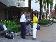 (二)采访刚开始,就有一个卖艺的人在我们前面弹琴高歌。学员发正念时感到心态不纯,卖艺人唱得更起劲了。后来一个学员悟到:我们应该去用真正的善心向他讲真象。当一位学员过去和他讲清真象之后,他变得非常支持我们,并签了名。