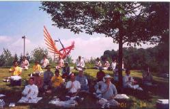 在周日的步行之前,基特利的马库斯.盖尔同其他法轮功学员一起在约翰保尔琼斯公园打坐落基山新闻:法轮功的哲学原理平和