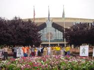 旧金山-华府长途车旅第十一日:俄亥俄州哥伦布斯市(Columbus, Ohio)7月16日,我们到达了哥伦布斯市(Columbus),俄亥俄州的首府。这里也是俄亥俄大学的所在地,所以学员大多是学生,在他们的帮助下,我们在州政府前举行了新闻发布会。早晨炼功时,骄阳似火,但在我们静下心来的时候,并不感到太阳的炎热,相反却感到了阵阵的凉风。