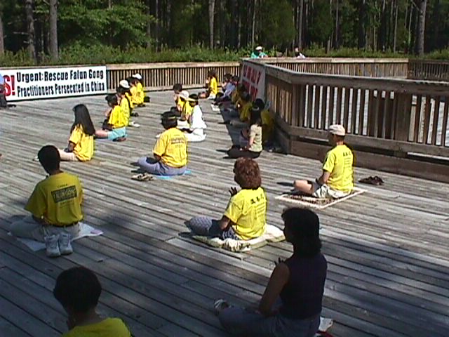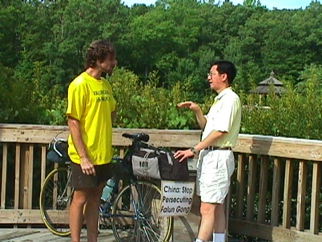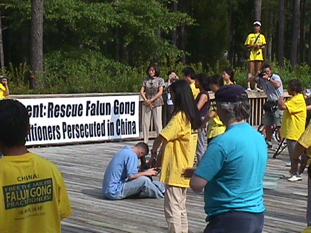 我们的活动一开始,便宣布当地的学员将加入车队,一同向DC进发。然后是给媒体的声明和一位学员的陈诉。大约有10来个人在公园参加了我们的活动。他们看起来很专注。在和他们谈话时,我们发现他们对中国赢得奥林匹克所做出的第一个反应是震惊和愤怒。而我们的反应,我认为应该说是镇静的。