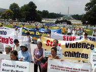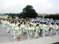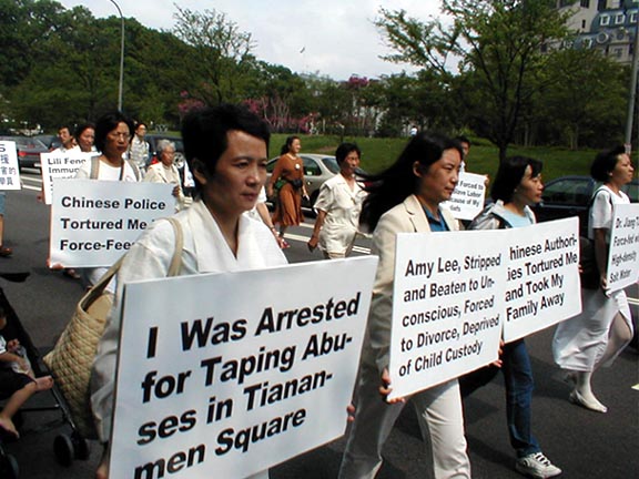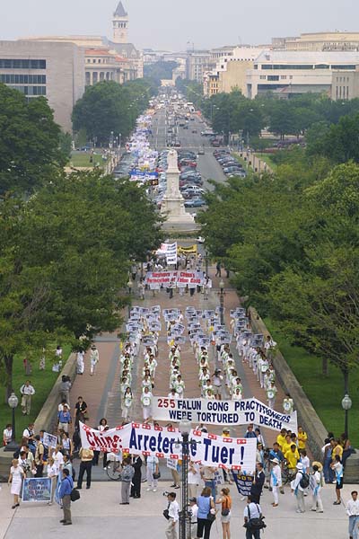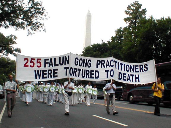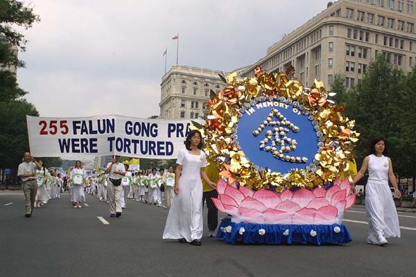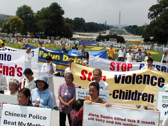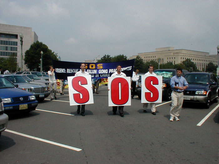 游行开始前,大法弟子宣读了一份英文的声明,声明中说“一个修炼真、善、忍的和平团体,他的成员仅仅因为坚持自己的信仰,就要冒着失去前途、自由乃至生命的危险,铺天盖地的谣言和惨烈严酷的刑罚却不能丝毫动摇他们对真理和正义的坚定信念。鲜血让我们擦亮眼睛,良知让我们不再沉默,今天我们相聚华府,为了呐喊出他们在中国被压抑的声音:紧急求救,请援救在中国被迫害的法轮功修炼者!现在我们从象征自由的独立纪念碑出发,让全世界正义的力量从这里开始汇聚成滚滚洪流。”