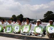 接下来的是被江泽民集团迫害的受害者及受害者家属,雄浑悲壮的音乐中他们泪落如雨。在他们的身后是一个巨大的花圈,两旁由两名身着白色长裙的台湾学员护送,9排身着白色长裙的女学员,手捧着死难学员的像片,神情肃穆,后面是一个巨大的“255名法轮功学员被迫害致死”的横幅。