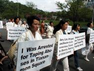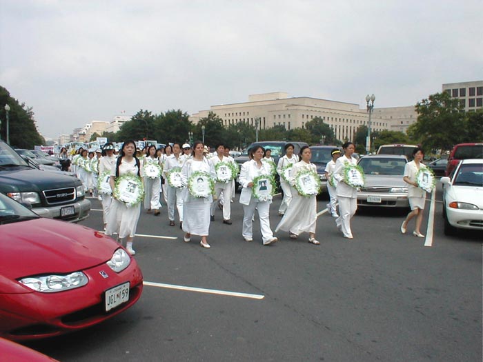 在他们的后面是18排手持控诉血腥迫害的小展板的白衣大法弟子。然后是由三名学员打出的“中国迫害法轮功的幸存者”横幅做前导,封莉莉教授,张昆仑教授,李明,吉米邹博士等人跟在后面,他们历经劫难,九死一生来到美国。