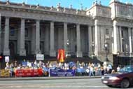 接着我们在市中心走了一个半小时,于大约下午两点钟抵达州议会大厦。参加我们步行的还有“2000年世界和平”地区代表里查德·弗莱彻和墨尔本市政府官员大卫·里斯特。弗莱彻并在州议会大厦前发表讲话,支持法轮大法弟子的人权。另外,“非暴力协会”也发来了一项对法轮大法支持的声明。