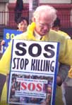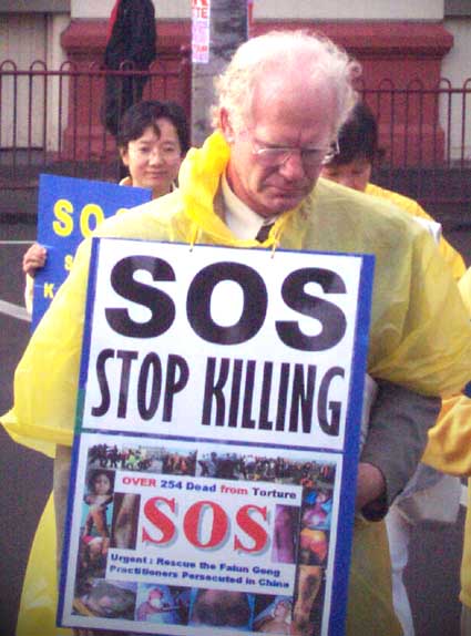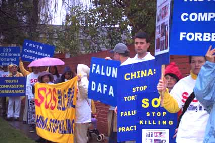 上午九点,近三十多名身着白色短袖圆领汗衫的大法弟子聚集在中国驻墨尔本总领事馆门外。他们的汗衫上写着英文的SOS和“中国停止虐杀”以及“救援中国被迫害的法轮功修炼者”。