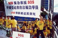 从香港政府总部出发,经过繁华的街道,天桥,学员们游行到达中联办。走在最前面的是记录255位死难学员姓名和照片的大花牌, 以红色SOS为先的十面大横幅和真相展览板依次在游行队伍中排开,吸引了众多市民的视线,很多人被震惊了。当我们路过一家餐馆时,几乎所有的顾客都站起来观看。