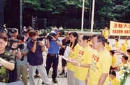 一位记者看到,一名年轻人被两名警察拖进警车,另一名警察把他持有的黄色法轮功会旗搓成一团。