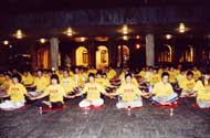 记者会结束后接着就是烛光纪念会,天色已暗,微风中,大会播放了「血泪斑斑,山河蒙尘」影片,许多人含着泪光看完了这部影片。普度音乐响起,天地无语,万物静默,学员们把烛光高举头前,共同悼念255位受迫害致死同修。
