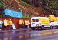 在来住的车流中,不时听到人们支持声援的汽车喇叭声,有人竖起了大拇指,有的行人放慢匆匆的脚步,接过一份洪法材料,边走边看。