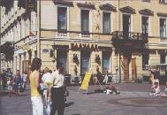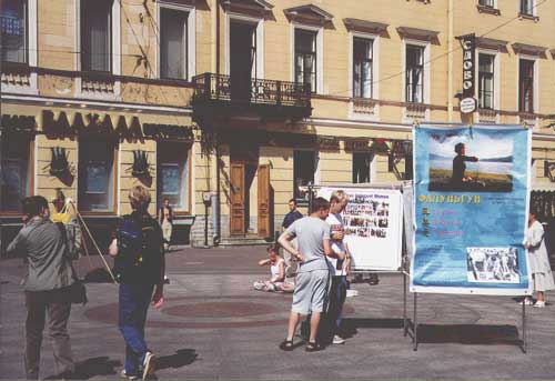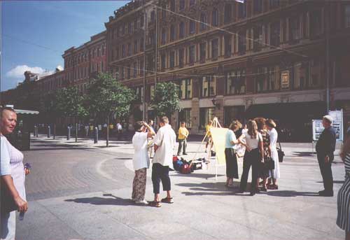 其他的学员在熙熙攘攘的大街人行横道上散发着赶制出来的“SOS!制止残酷迫害虐杀法轮功学员”的报纸与洪法宣传资料。许多人读到后都感到非常的震惊,很多人当场在签名簿上签名表示支持。