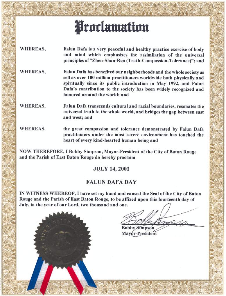 【明慧网2001年7月28日】路易斯安那州州府巴吞鲁日市宣布2001年7月14日为“法轮大法日”。