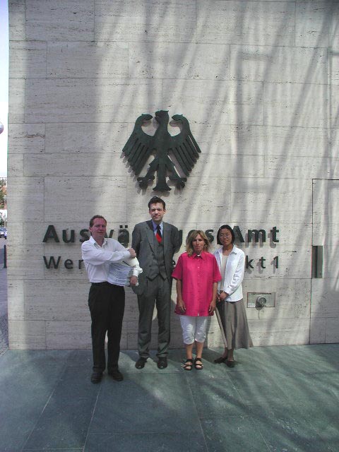行进中,我们在大街上发报纸,几名同修向大臣贾斯卡·菲思克尔(Joschka Fischer)递交了众多民意签名。当“SOS呼吁紧急救援”游行队伍到中国大使馆时,我们遇到了在那里坚持请愿200小时以上的大法弟子们。大家在一起进行了集体炼功并散发了介绍大法和揭露迫害的传单。
