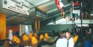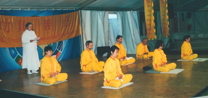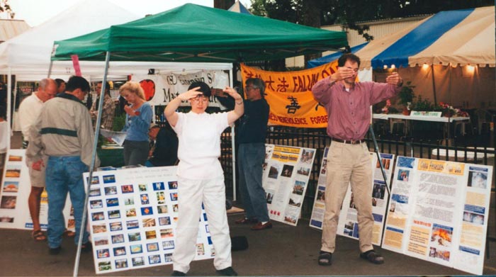 功法表演在庄严的普度音乐中拉开序幕,接着是柔和的炼功音乐。为了让人们更多地了解大法以及目前在中国发生的惨无人道的迫害,西人学员精心设计了一套解说词,在功法表演的同时为观众介绍功法的简单动作要领、机理、法轮功在世间的洪传、及目前中国对法轮功的残酷迫害。柔和的音乐,优美的功法,清晰的讲解,祥和的能量场仿佛把人们带到了另一个世界,吸引了大量的人驻足观看。许多人询问了在中国发生的迫害,认真阅读了我们的展板,表示了对法轮功的支持。许多人早已听说了法轮功,这是第一次亲眼看到,他们所见到的与中国政府的宣传多么的不相符。很多人索要大法资料,询问在哪里学功、买书。还有的人模仿我们的动作,跟我们一起做。最后一天快结束时,来了一位小伙子,他从加拿大温哥华来,问了许多问题,迟迟不愿离去,反复拿起<<转法轮>>不忍放手,因为我们只有一本作为展示,他不好意思开口要这本书,但又真舍不得走,我们学员看出他的心思,把书给了他,他高兴得象天真的孩子终于得到了宝贝一样,乐呵呵满意而去。我们深深地感受到了师父的慈悲,以不同的方式让有缘人得法。