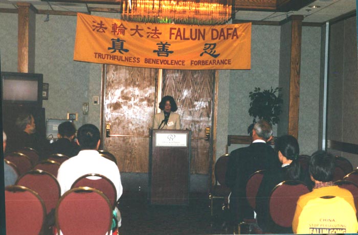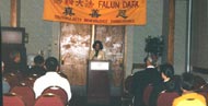 2001年7月18日,波特兰大法学员在Double Tree Hotel会议厅举行新闻发布会,揭露以江氏为首的中国政府对法轮功学员的惨无人道的迫害。一些学员发言,并放了侵犯人权及自焚疑点录像带。这是本市第一次举办这样的活动,从写邀请信,发邀请,更新展板,租赁场地,准备发言稿等等,学员们克服了许多困难,投入了大量的时间与精力,临近会议前,一对西人夫妇学员每晚只睡3-4小时。整个过程非常成功,在准备发布会的过程中大家都向内找,去发现自己工作中的执著,每个人都在洪法与讲清真相中提高与升华。