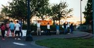 7月21日傍晚,我们在市中心河边公园炼功及烛光守夜,纪念为护法、正法而失去人的生命的大法弟子。傍晚时分人来人往,许多人都过来看我们的展板,拿资料,在学员们受到残酷迫害的照片前驻足良久。还有的人当场拿出钱来要帮助我们。当我们告诉她不接受捐款时,她祝所有象我们一样善良的人们好运。但当晚的活动也受到邪恶的骚扰,一位骑自行车的白人公开表示不相信真、善、忍,支持中国政府,然后骑车匆匆离去。 另外还有两位中国人来到我们的炼功场,当时我们正在抱轮,他们仔细打量每个炼功的中国人,看周围没有人注意,拿起相机要拍照,在旁边照看小孩的学员看到后快步走过来,先给他们照了一张,于是他们慌慌张张的赶紧溜走了,一边走还一边不时地回头看。这也更使我们认识到邪恶的猖狂,今后我们也一定要更努力地去洪法,从而窒息邪恶。
