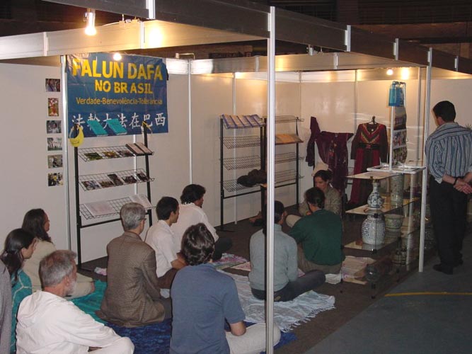 当天晚些时候,我们去了展览会,并得到了一个小展位摆放大法资料,书籍和录像带。他们还特别安排了两个小时的广泛面向公众的功法介绍和信息发布会。炼功其间,巴西最大的电视网络Globo,来到展会,录下了功法表演,采访了许多参观者,然后采访了我们。采访者在得知在中国(对法轮功)的迫害后非常震惊,他们问了很多问题,我们正好能够借机向他们讲清真相。信息发布期间,我们简明地介绍了大法,然后参观者做了提问。